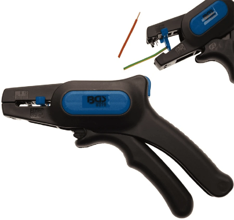 - vornschneidend, mit einstellbarem Längenanschlag für Abisolierung von 8 – 12 mm