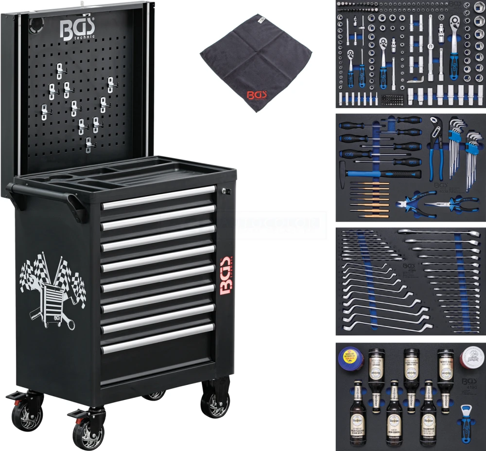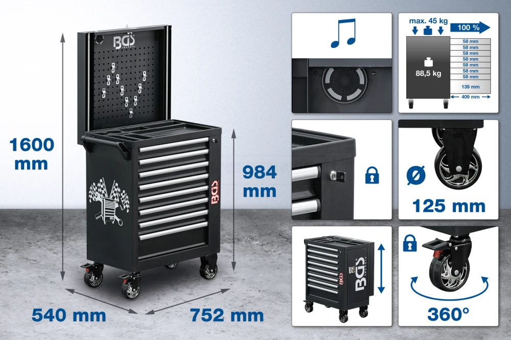 - bestehend aus Werkstattwagen Art. 4108 inkl. 4 Werkstattwageneinlagen 3/3 aus robustem, hochwertigem Hartschaum (Abmessungen 567 x 408 x 32 mm)