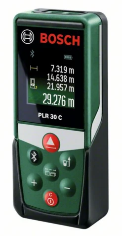 Digitaler Laser-Entfernungsmesser PLR 30 C. Ihre Messergebnisse auf einen Blick! Präzises Messen von Entfernungen bis zu 30 m mit Lasertechnologie. Bequemes Dokumentieren von Messergebnissen via Bluetooth mit der Bosch App PLR measure& go. Ausgestattet mit einem hochwertigen Farbdisplay für die optimale Lesbarkeit der Messergebnisse. Einfaches Bestimmen von Längen, Flächen und Volumen dank integrierter Messfunktionen. Messen ab Vorder- und Hinterkante. Kompaktes Gerätedesign – passend für jede Hosentasche. Dauermessmodus mit Min/Max Funktion. Addition und Subtraktion der Messergebnisse. Schutztasche, Batterien 2 x 1,5-V-LR03 (AAA)